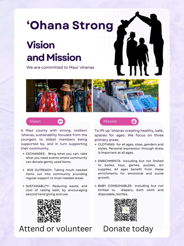 The 'Ohana Keiki Exchange is our largest event each month, with 80-100 families attending. Happening every second Saturday except in May at Kihei Lutheran Church. Volunteers needed 7am-1pm, shopping is 9-11am. Please see social media and or monthly email for details on donations that month. Providing a place for families to donate and take gently used and new clothing, books, games, toys, puzzles, baby items and more. The fri night before event is a community work day from 3pm-9pm.
